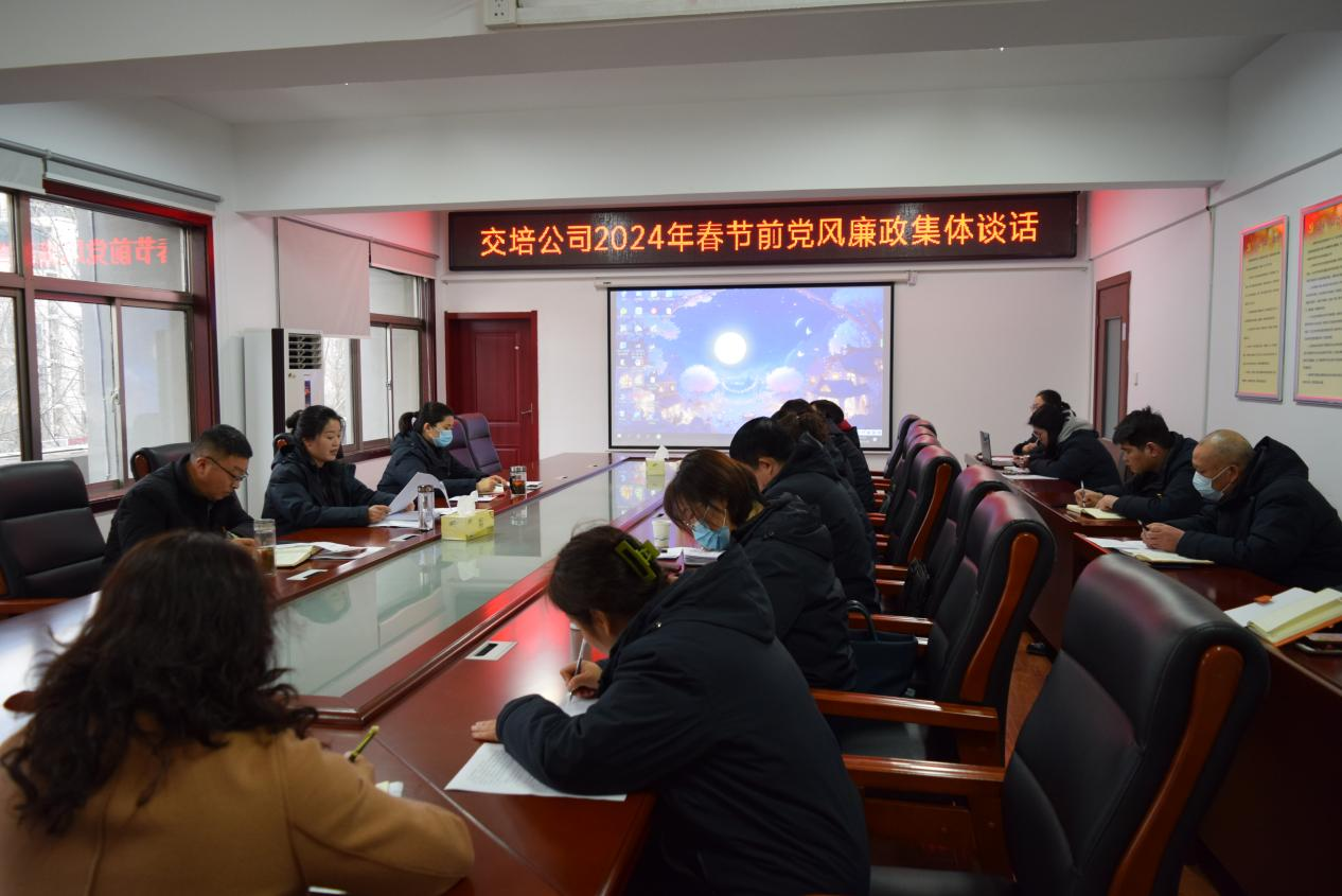 近日,交培公司召开春节前党风廉政集体谈话,公司领导班子成员、全体中层干部参加此次会议,会议由党委书记、总经理李霞主持。