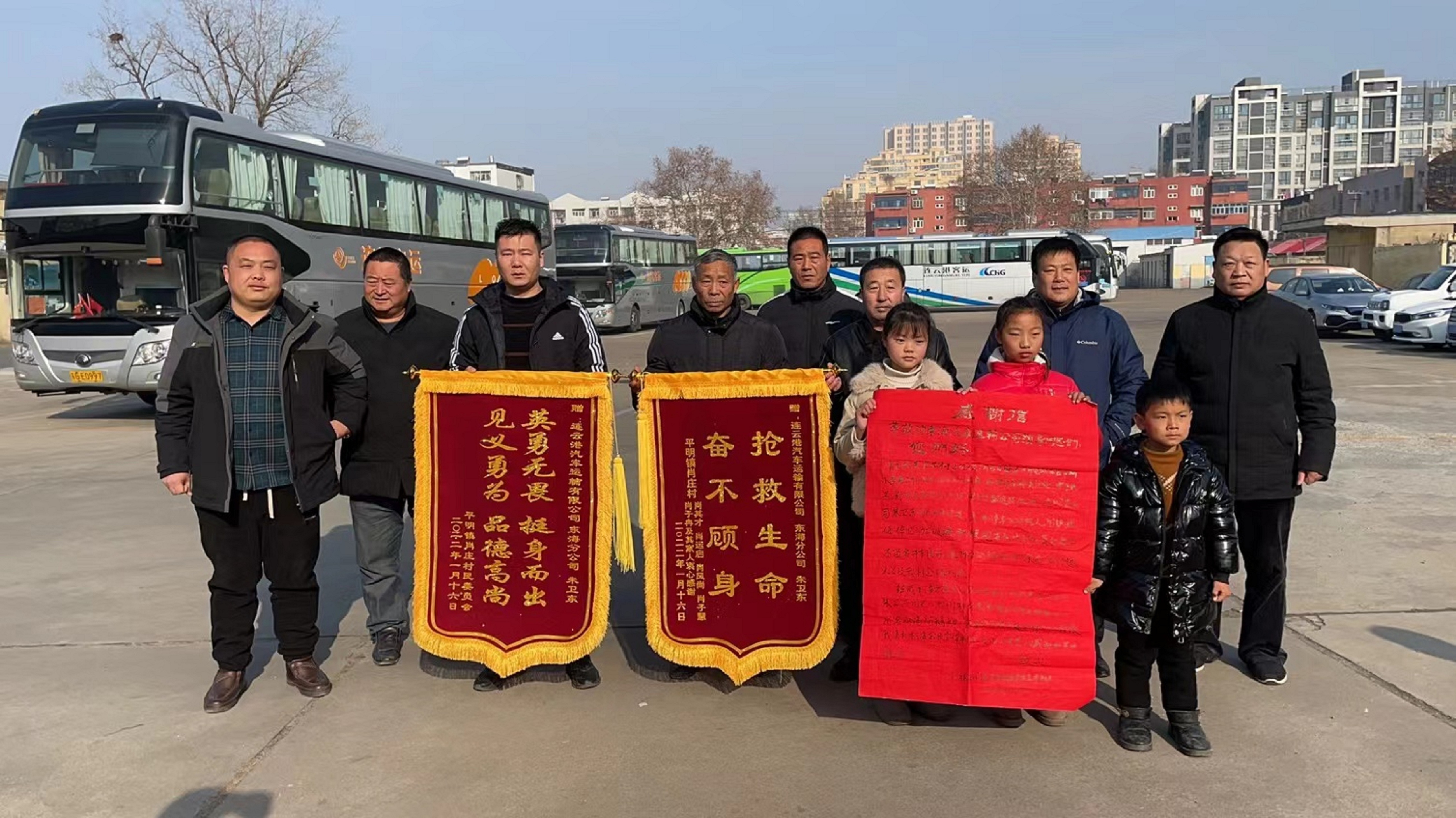 虽然事情已过去好多天了,但是驾驶员朱卫东热心救人的善举让肖其才家属久久不能忘怀。为表达感激之情,家属通过联系平明镇党委,得知朱卫东是连汽东海分公司驾驶员1月16日,家属及其肖庄村支部书记和村长专程赶到连汽东海公司,将一封感谢信和锦旗送到“恩人”朱卫东手中家属突然扑通一声跪地哽咽着向朱卫东连声致谢。朱卫东赶紧上前将家属扶起,再三表示这是自己应该做的。肖其才回忆起事情经过时,依然哽咽多次,感激不已。肖其才说:当天晚上,开着电动轿车接三位孩子放学回家,由于天黑,对面来车强光所照,电动轿车翻进路边河里,感谢朱师傅在关键时候伸出援手,救人于危难,如果没有他的帮助,后果不堪设想。朱卫东谦虚地说自己当时正好路过那里,只是做了一件应该做的事,救人要紧。虽然下水受了点风寒,但是一想到把人救回来了,心里还是很满足的。