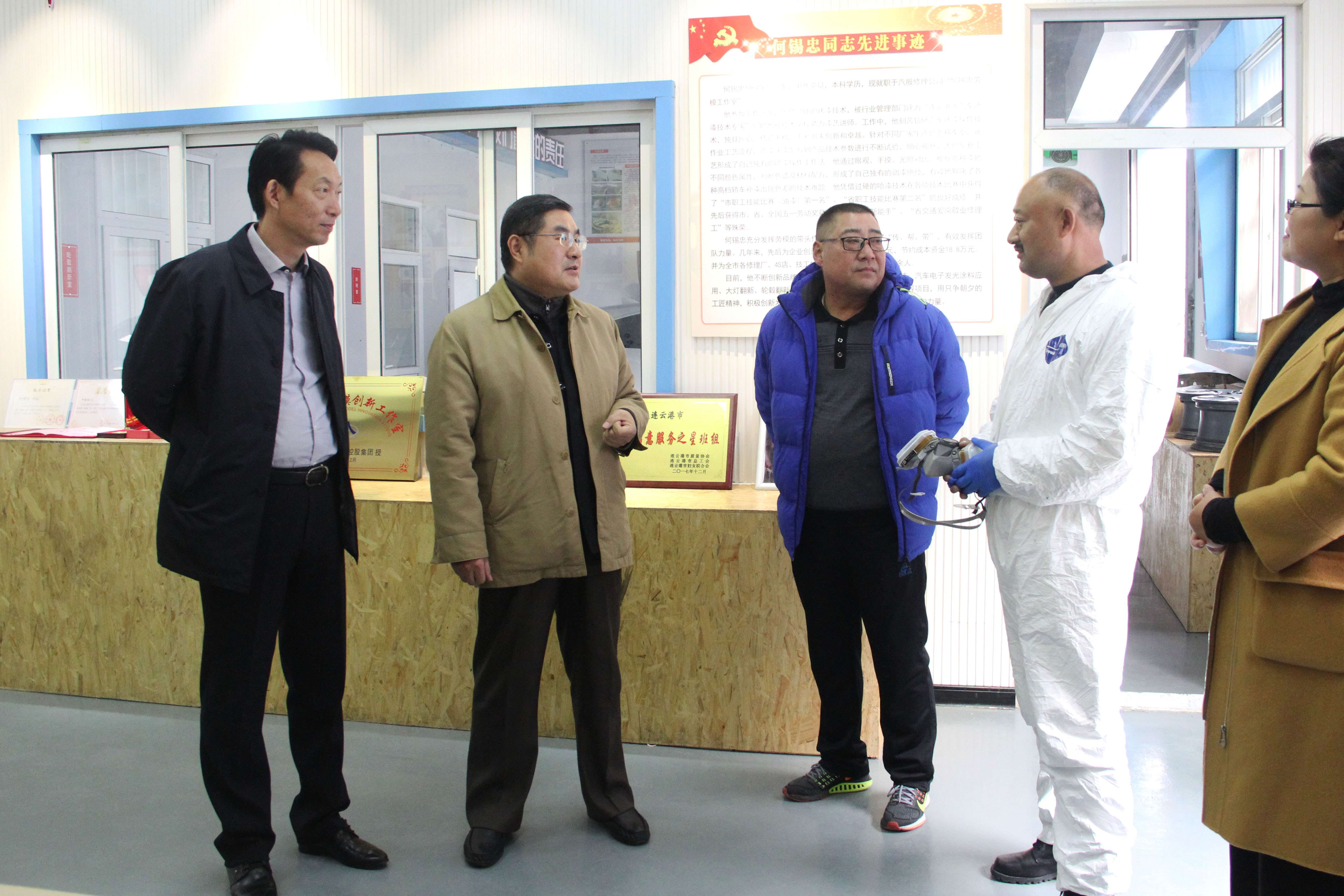 11月29日下午,市总工会副主席陈键,劳动和经济工作部部长许小兵、副部长周佃元,易游app最新版下载,易游(中国)工会主席王中永及工会相关负责人,到海通汽服公司修理公司指导“何锡忠劳模工作室”建设工作。