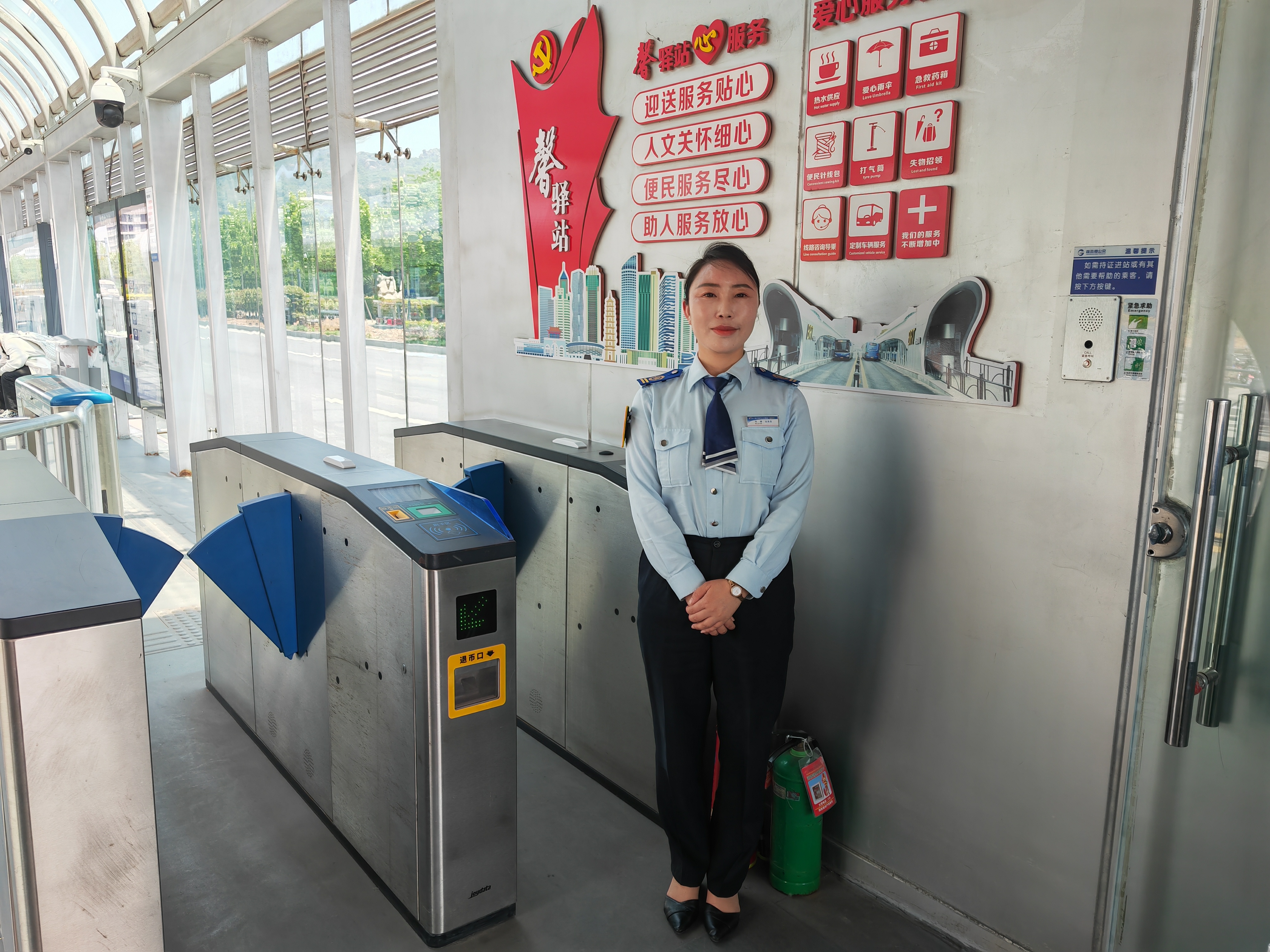 就在紧急当头,体育中心站的站务员毕峰发现后迅速把站台灭火器提出去,并呼喊货车司机把灭火器拿过去灭火,火势不到一分钟的时间就控制住了,一罐灭火器用完后,毕峰担心火种还残留在车上,立即去储物间接水,对着货车进行再次处理面对站务员的热心帮助,货车司机激动的说道:“要不是您的帮助,我这车就烧成灰了,太感谢您了”。“遇到这种事,谁都会帮忙的”毕峰说完便回到自己的工作岗位上了。