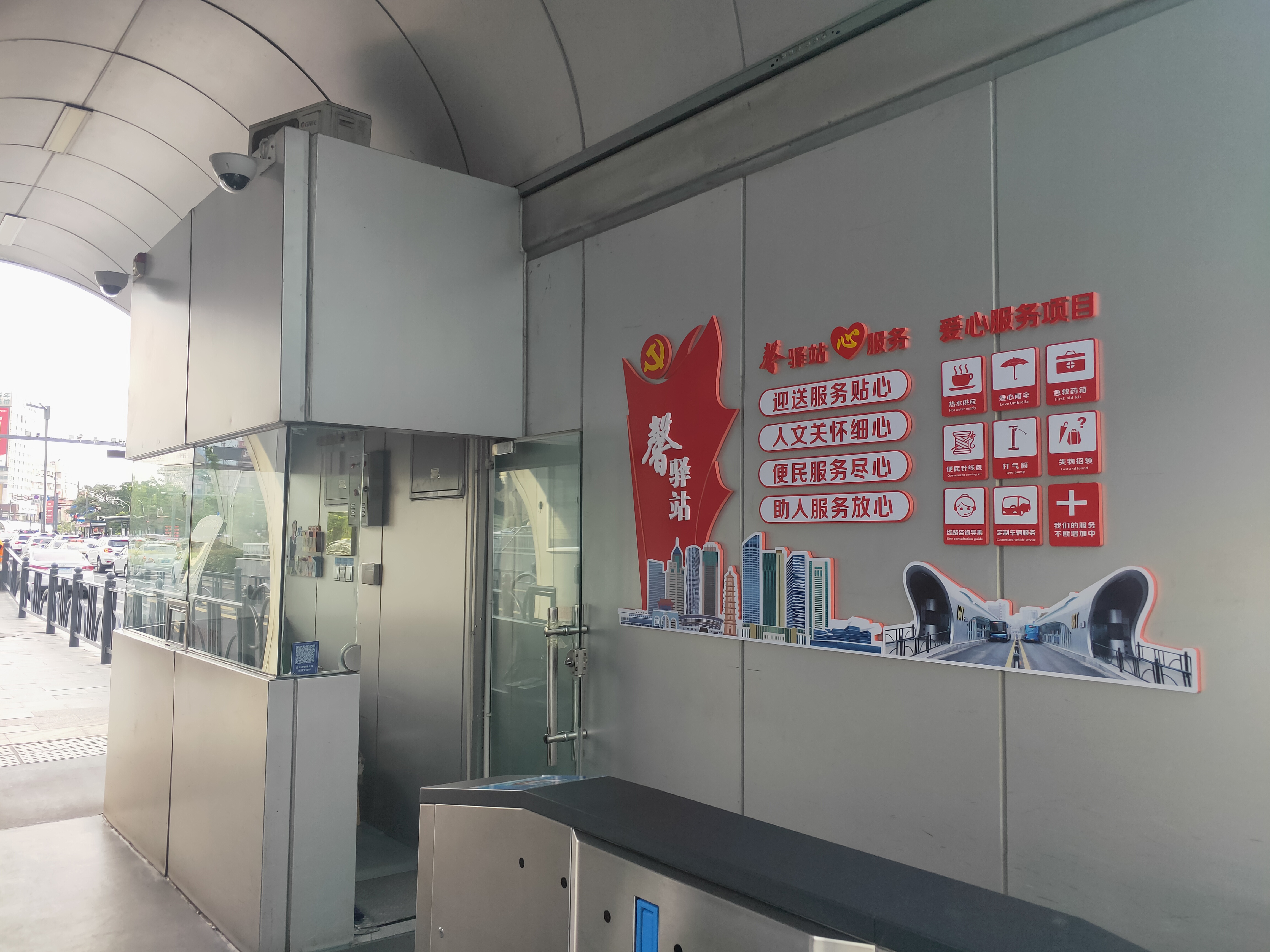 党史站台在城市中充分发挥着风景线作用,站台灯厢反面以党史学习教育标语为重点,骄傲地向来往车辆人群宣传着“热烈庆祝中国共产党成立100周年”。出站后站房墙面BRT“馨驿站”一定会吸引我们的目光:“馨驿站”服务内容、服务理念无不诠释着快速站务班组以党建为引领,积极践行“善小常为,服务便民”的理念。